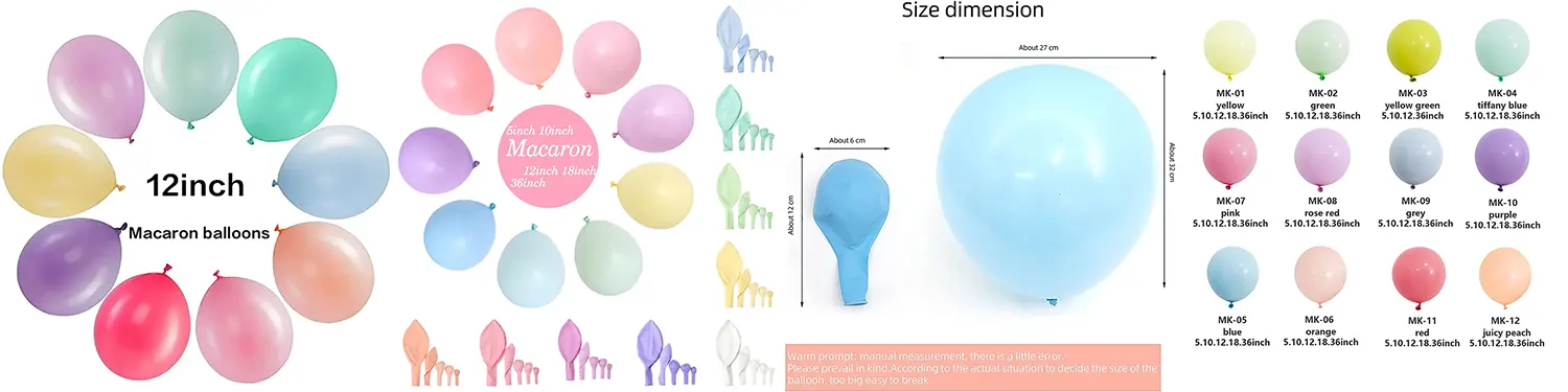 Producción estricta: línea de producción eficiente combinada con una inspección de calidad estricta (fábrica certificada ISO 9001), todos los globos de látex macaron de 12 pulgadas han sufrido múltiples pruebas experimentales para garantizar un grosor uniforme (0.25-0.28 mm), sin defectos y la velocidad de estallido (<0.01%) es mucho más bajo que el estándar de la industria.