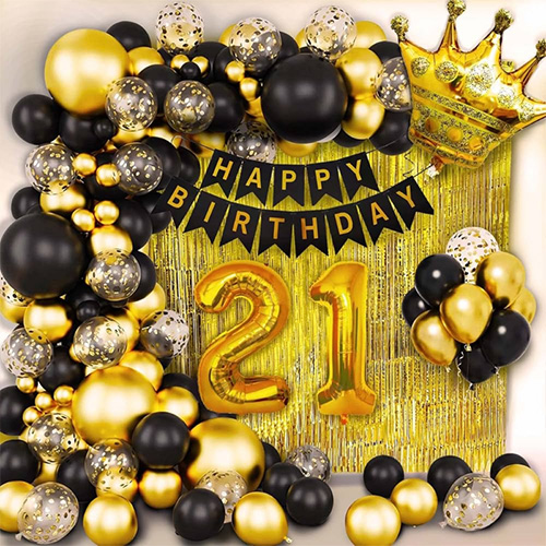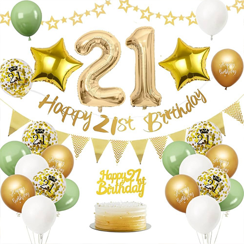 Juego de globos número 21: este juego de globos número 21 se compone de globos de látex, globos de aluminio, banderas de cumpleaños y otros accesorios. Es fácil de montar y puede hacer que su fiesta de cumpleaños número 21 sea más ceremonial. Un entorno tan impresionante y de alta calidad le ayudará a alegrar la noche de su cumpleaños número 21 y a hacer de este un momento precioso que su hija, usted y toda la familia nunca olvidarán.