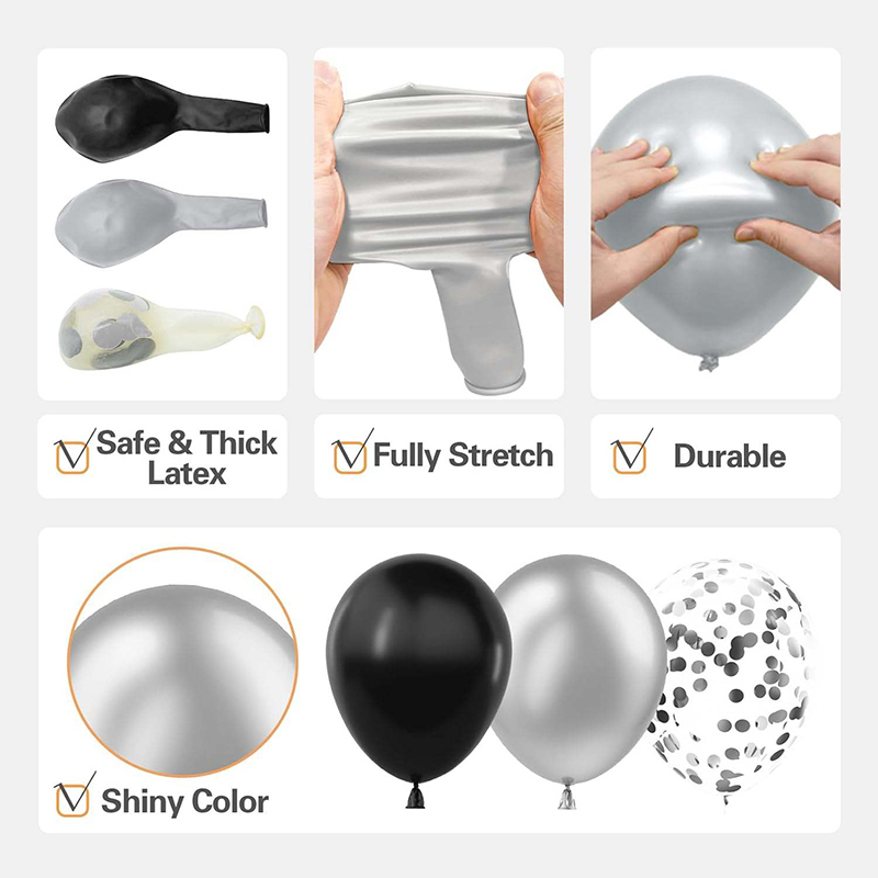 Las decoraciones de los kits de guirnaldas de globos negros y plateados de moda a menudo utilizan globos de látex. Tienen diferentes tamaños. Los colores son negro mate y plata metalizado. Tienen capas claras y un bonito brillo a juego. Todo el look es completo y tridimensional. El látex de buena calidad hace que los globos sean elásticos y suaves. No estallan fácilmente. Incluso cuando se colocan durante mucho tiempo, se mantienen llenos y redondos. No perderán aire ni perderán color fácilmente. Algunos juegos también tienen globos de aluminio. Estos añaden una apariencia reflectante. Hacen que toda la decoración sea más brillante y tienen un tacto agradable. Muestran un estilo moderno y elegante.
