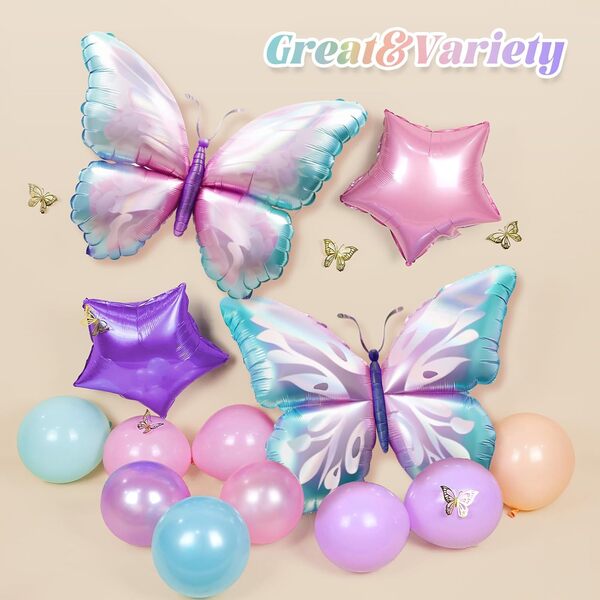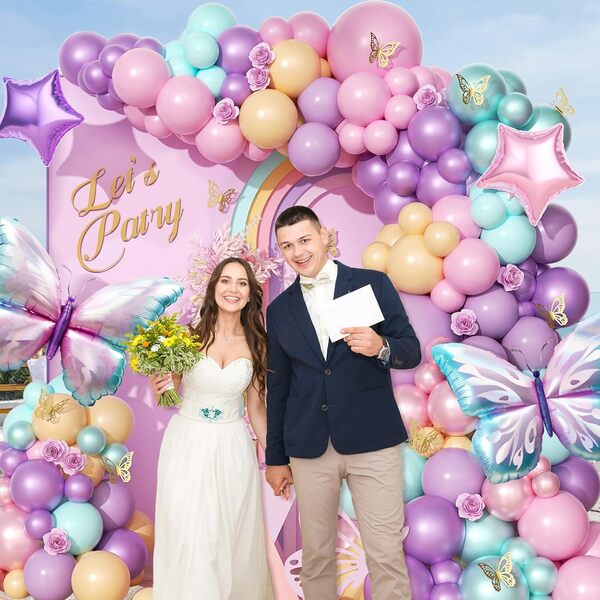 Kit de arco de globos de mariposa: el kit de arco es colorido y llamativo, está compuesto por varios globos de aluminio y globos de látex. Cuando lo organices, agrega un tablero de fondo con patrones y texto diferente, y luego rodea los globos a su alrededor. Es el creador de la atmósfera en el evento. Tomar fotos frente a él se verá muy hermoso.