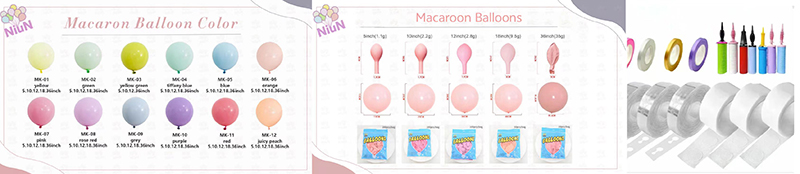 El set también viene con cadena de globo Niun®, puntos de pegamento, cinta y otras herramientas. Puede usar estas herramientas para combinar globos libremente. Puedes hacer una guirnalda o una pared de fondo. También puedes mezclarlos con globos de aluminio y globos mágicos. El resultado es una decoración con más profundidad y efecto 3D.