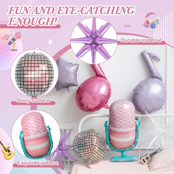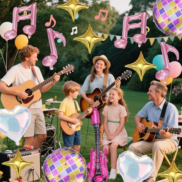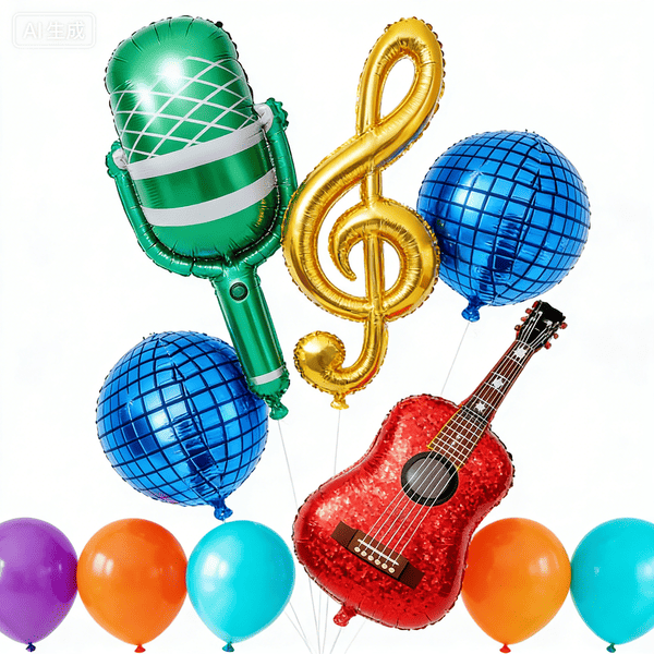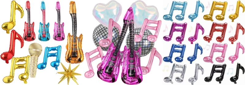 Globos de papel musical.Los hay de diferentes tipos, como globos de aluminio para instrumentos musicales (globos de aluminio para guitarra, globos de aluminio para micrófono) y globos de aluminio para notas musicales. A medida que la música pop se vuelve cada vez más popular, ahora poseen un gran mercado. Por ejemplo, la película: Kpop Demon Hunters ahora es un virus en los Estados Unidos. Muchos adolescentes americanos esperan incorporar elementos musicales relevantes en sus fiestas de cumpleaños para rendir homenaje a esta película. Para satisfacer todas las necesidades de los clientes, hemos preparado para ellos los diferentes colores: para niños puedes usar azul oscuro, azul, negro y marrón; Para las niñas, puedes usar rosa, rosa claro, morado, etc. Siempre hay un color adecuado esperándote. Tienen una gran flexibilidad y puedes combinarlos de la forma que quieras, como agregar algunos globos de látex para hacer un juego de guirnaldas de globos musicales, o usar varios globos para hacer un juego pequeño de globos musicales.