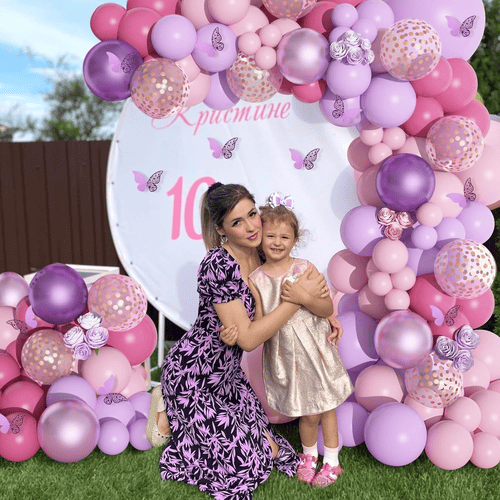 El juego de guirnaldas de globos rosa morado es uno de los juegos de globos más vendidos en NiuN®. Con colores atractivos y superficie brillante, muchas personas lo adoran, especialmente las niñas. Viene con varios globos de látex. El color de ellos es rosa y morado. Además del globo de látex normal, también agregamos globos de confeti para aumentar más capas.