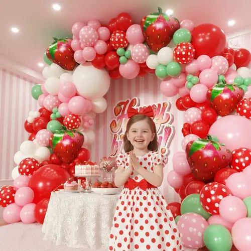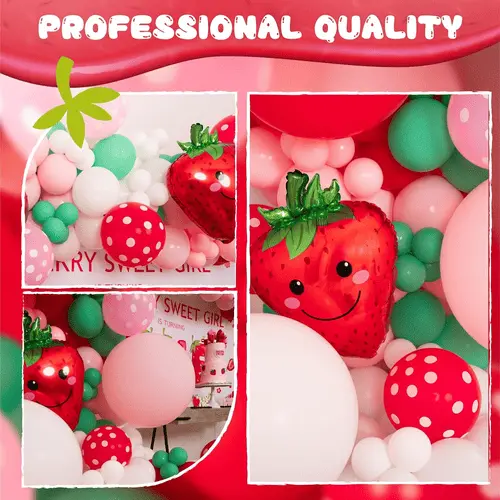 Los globos que ofrecemos en la guirnalda de globos con temática de fresas son de alta calidad. El globo de látex que ofrecemos está hecho 100% de látex crudo importado del sudeste asiático. La materia prima es totalmente ecológica e inocua para los niños. El globo de aluminio que ofrecemos está hecho de una película laminada resistente que puede reutilizarse después de un buen almacenamiento.