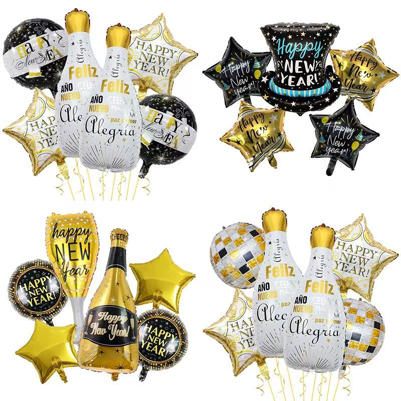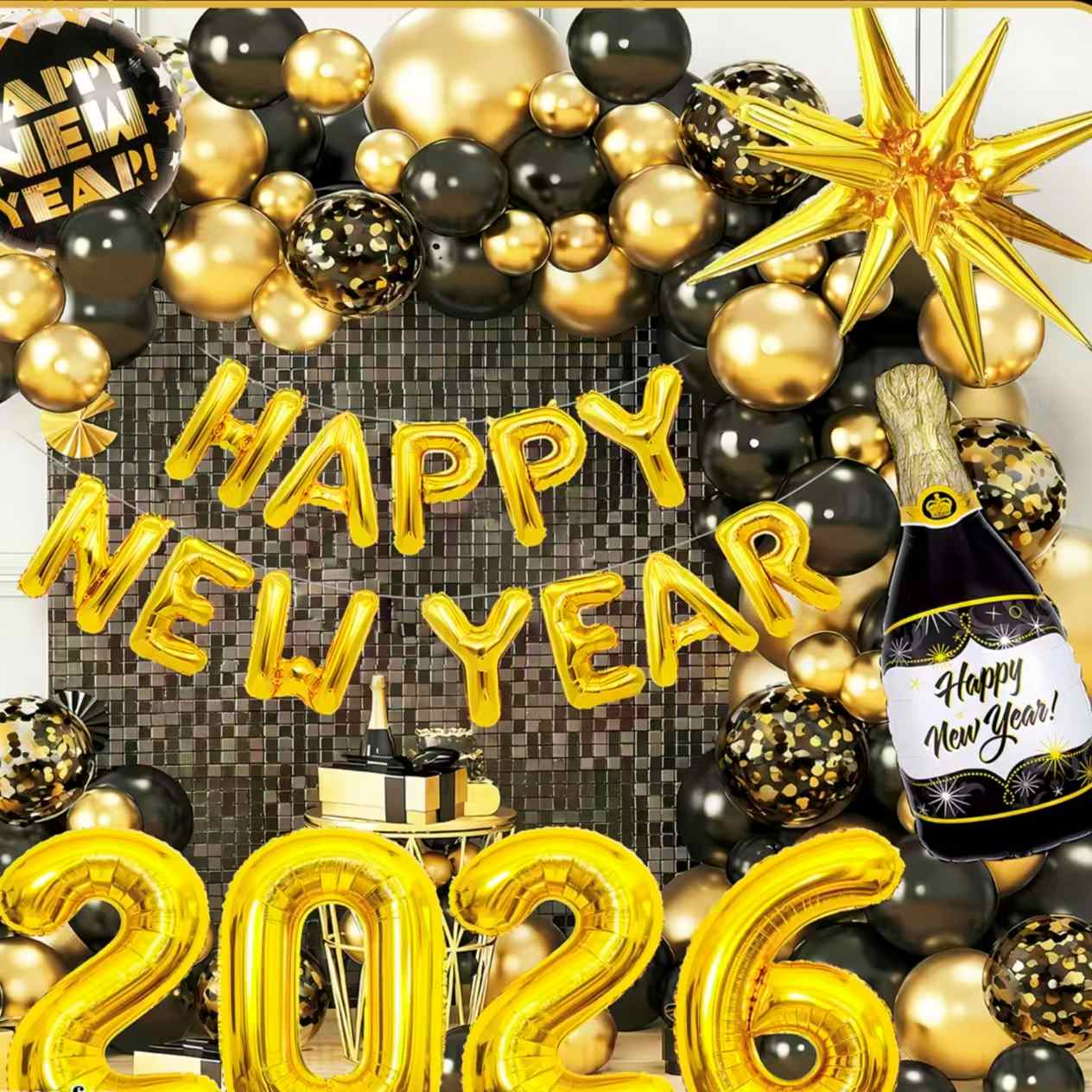 Piense en el conjunto con temática de Año Nuevo. Tiene globos de aluminio que parecen botellas de champán. También incluye globos con números "2026", globos decorativos de estrellas y más. Los colores principales son el negro-oro o el oro-blanco. Está lleno de alegría festiva de Año Nuevo. Puede crear fácilmente una escena de fiesta de Año Nuevo lujosa y ceremonial.