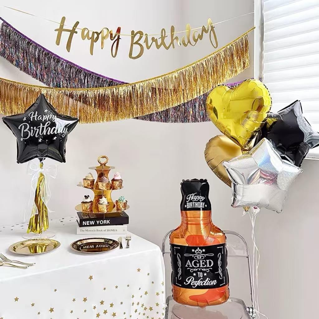 También hay un set con temática de cumpleaños. Los lindos globos rosados con forma de botella de vino están diseñados con globos de aluminio en forma de corazón y globos con letras "Feliz cumpleaños" y el color oro rosa es muy romántico y cálido. Agrega una sensación dulce a la fiesta de cumpleaños.